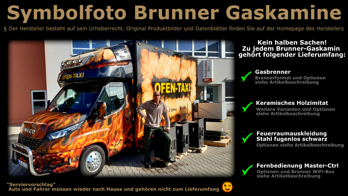 Die Geräte-Börse liefert seit Jahren erfolgreich mit dem optionalen Lieferservice OFEN-TAXI. Für Gaskamine von Brunner gilt dabei, dass ich die Geräte ausschließlich im kompetenten Fachgroßhandel oder im Werk Brunner verlade und ohne weiteres Umladen direkt zu Ihnen bringe. Direkt, schnell, trocken und sauber im geschlossenen Kofferfahrzeug.